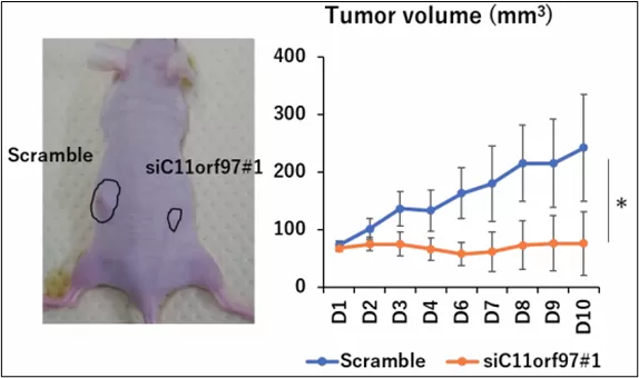 - siRNAによる発現抑制で抗腫瘍効果を確認:in vitroおよびマウスXenograftモデルでC11orf97のノックダウンにより腫瘍縮小効果が得られている。