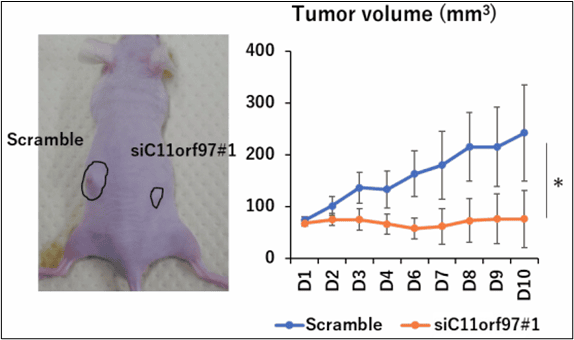 - siRNAを用いた抗腫瘍効果:C11orf97に対するsiRNAを投与したマウスXenograftモデルにおいて、腫瘍体積の有意な抑制効果を確認した(下図)。