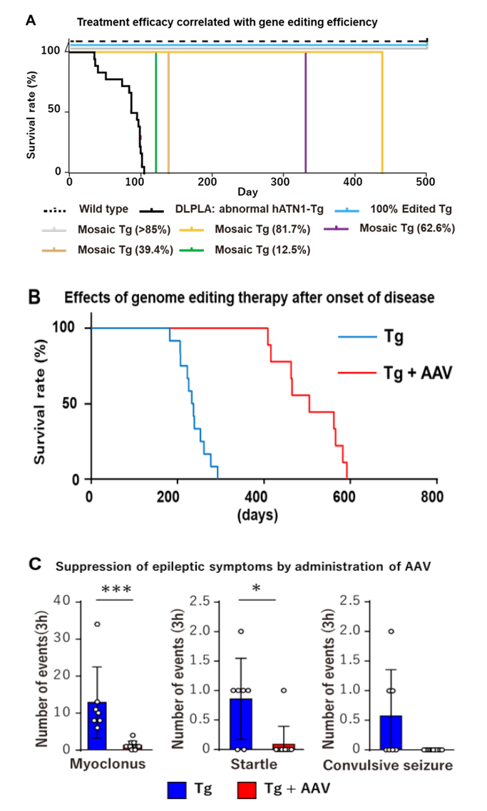 発明者らは、CRISPR/Cas9を用いたゲノム編集により、CAGリピート配列の上流にフレームシフト変異を誘発することで、ストップコドンを生成し、ポリグルタミン異常タンパク質の翻訳を抑制させることに成功した。ヒト変異ATN1遺伝子が導入されたDRPLAモデルマウスを用いた実験では、100%編集個体で完全な発症抑制が確認され、モザイク編集(12.5%〜92.8%)個体においても、編集率に応じた改善効果が見られた。また、発症後にAAVを利用してゲノム編集コンストラクトを投与することで、病態進行を抑えることができ、最も重篤な症状であるてんかん発作をほぼ完全に抑制する効果が得られ、発症後治療としても有効性が確認された。