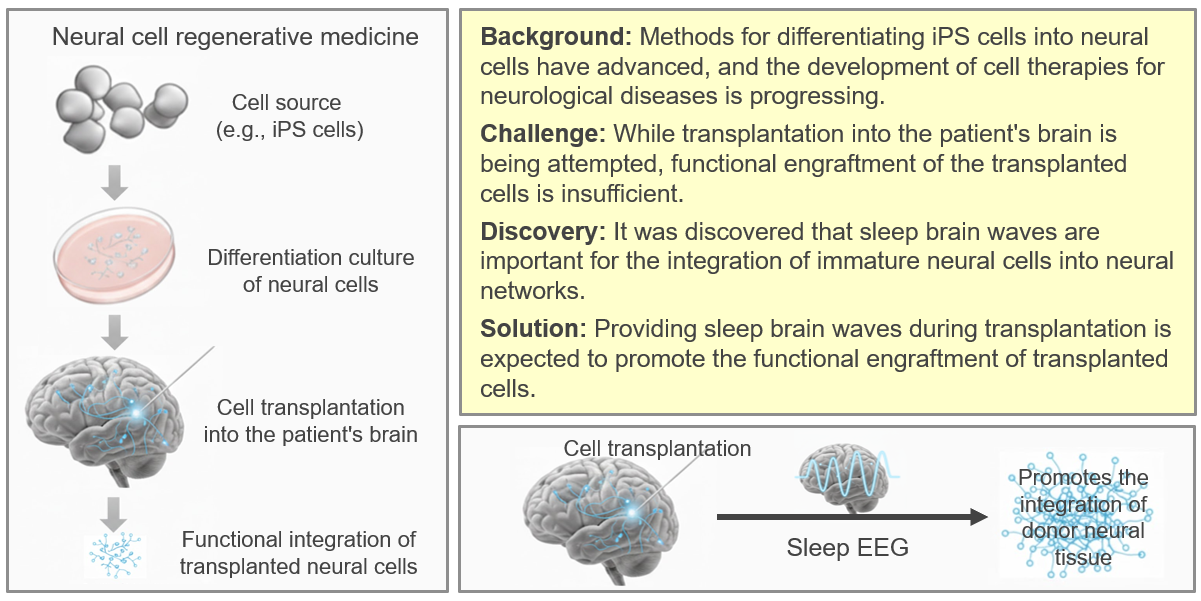 解決策:「細胞統合促進システム」の開発 この知見を応用し、レシピエントの脳波をAIでリアルタイム解析してレム睡眠を特定。神経の可塑性が高まるシータ波の「特定の位相(タイミング)」に合わせて、移植細胞へ刺激を与えるシステムを着想した。