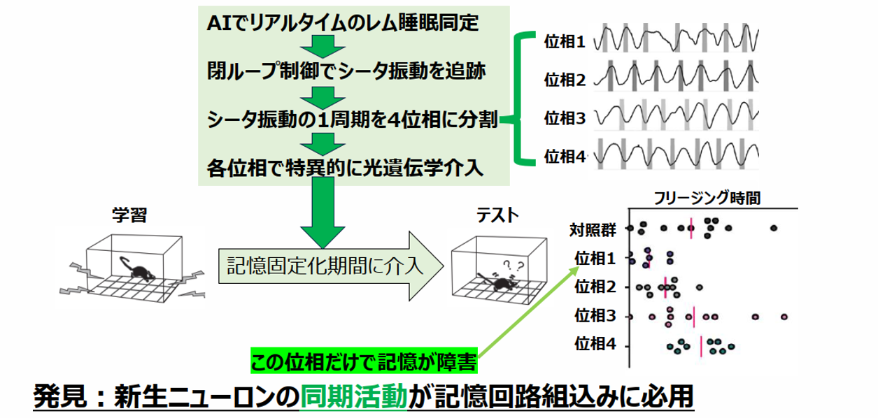 ・マウスに侵襲刺激を与えて学習させた後、記憶の固定化が行われる「レム睡眠」の期間中に光遺伝学的な介入を行った。 脳内振動である「シータ波」の1周期を4つの位相に分割し、各位相に同期して刺激を与えた。その結果、特定の位相で介入を行った場合において、学習の定着を示す恐怖反応(フリージング時間)の短縮が観測された。